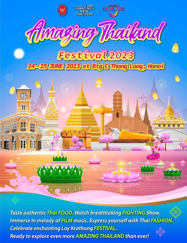 Sự kiện do Đại sứ quán Hoàng Gia Thái Lan và Tổng cục Du lịch Thái Lan tổ chức tại Big C Thăng Long (Hà Nội). Sau thành công rực rỡ của lễ hội tại TP.HCM, Amazing Thailand Festival 2023 Hà Nội hứa hẹn sẽ là trở thành địa điểm vui chơi, giải trí, tìm hiểu văn hóa du lịch xứ sở chùa Vàng hấp dẫn nhất mùa hè này của người dân Thủ đô.