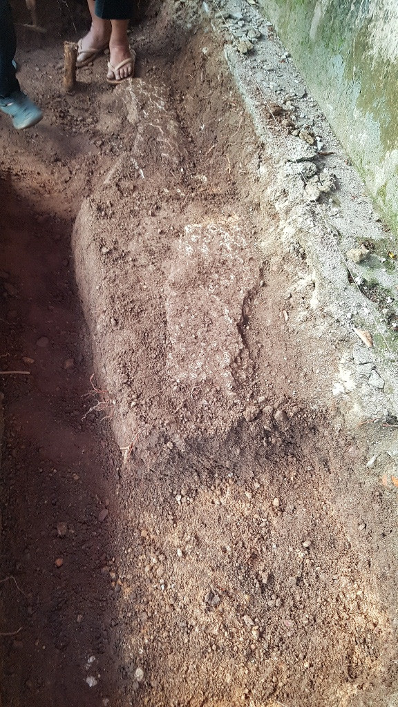 Dấu vết các lớp đá xếp ngay ngắn thành 2 hàng trùng với hình hố khảo cổ chữ L. Qua quan sát của PV, lớp đá này gồm khoảng 5 tảng đá khá lớn đặt theo 2 hàng ngày ngắn vuông góc với nhau, đoạn giữa có khuyết một đoạn không có đá. Riêng đoạn cuối lớp đá ở hàng song song với bờ tường là một lớp vôi tiếp nối, cùng với lớp đất lạ nghi giống như cát vàng và sỏi. Lớp đất này khá giống lớp đất ở hố thứ 3 ở nhà ông Nguyễn Hữu Oánh tìm được ngày hôm qua nghi liên quan công trình kiến trúc.