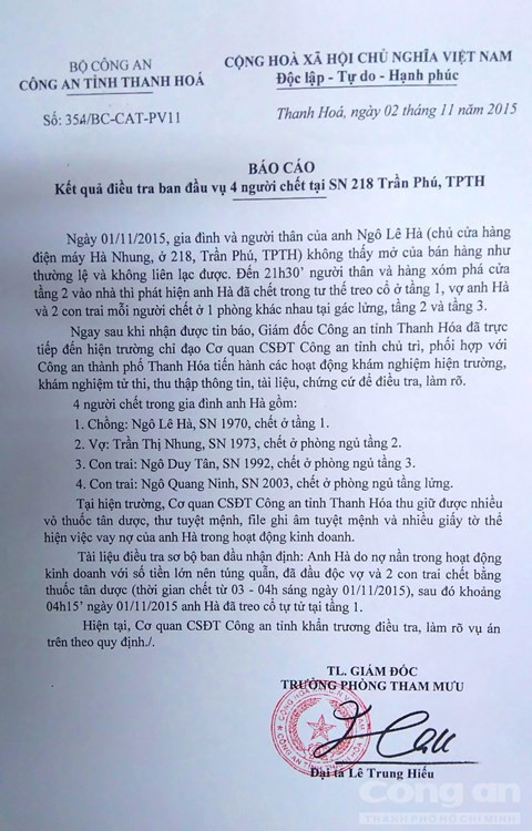 Công an tỉnh Thanh Hóa đã có báo cáo sơ bộ kết quả điều tra ban đầu do Trưởng phòng tham mưu Công an tỉnh Đại tá Lê Trung Hiếu ký.