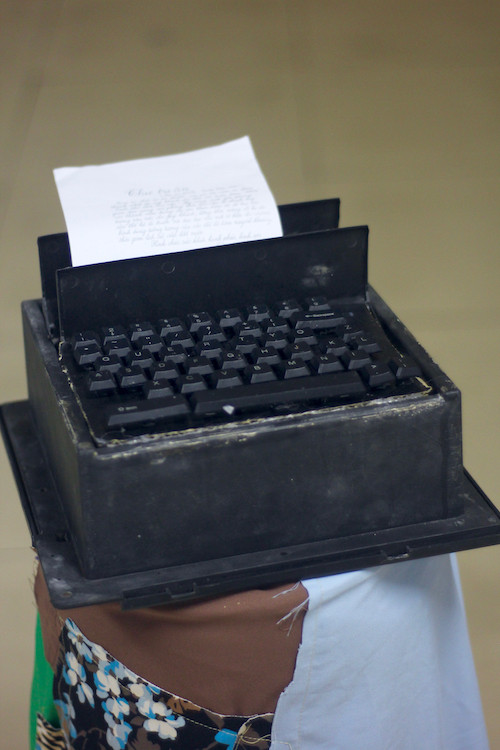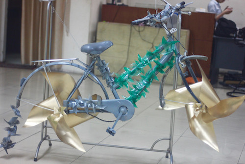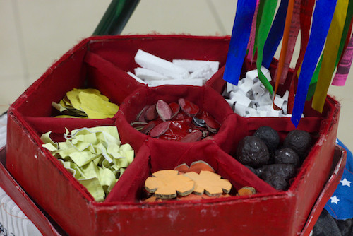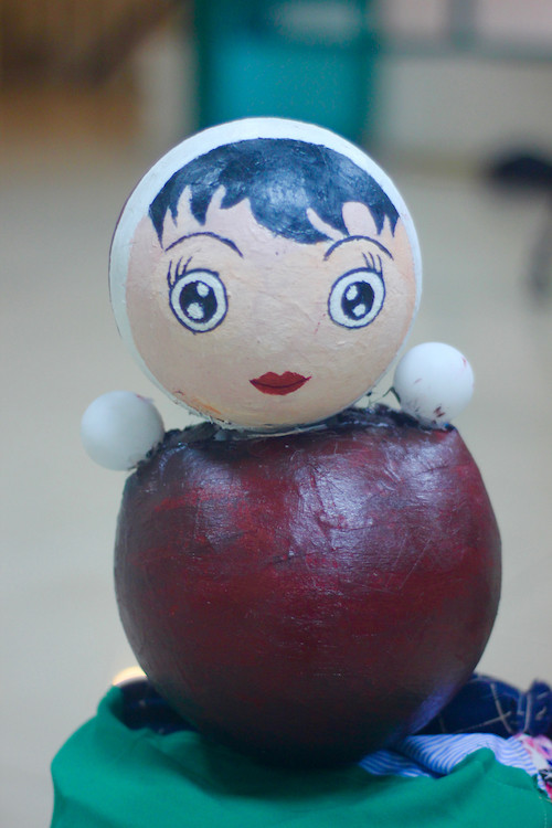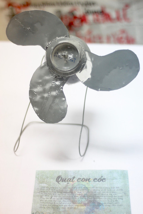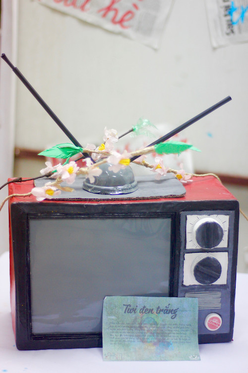 Người xem có thể bắt gặp chiếc máy đánh chữ làm từ... bàn phím máy tính, tivi làm từ hộp carton, hộp mứt làm từ bìa và lật đật làm từ quả bóng xịt.