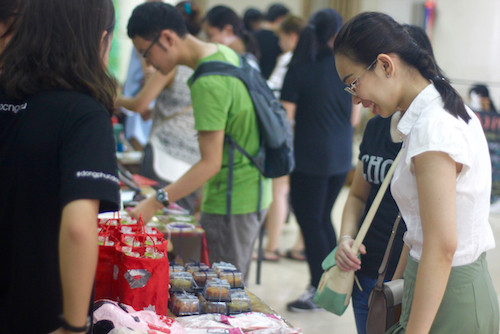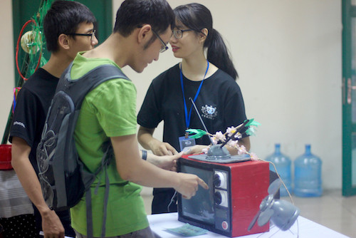 Các bạn trẻ thích thú khi thấy các sản phẩm tái chế sáng tạo.