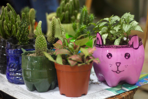 Ngoài ra, khu kiot bán hàng với sản phẩm chậu cây làm từ vỏ chai, lọ hoa làm từ cốc nhựa... cũng được rất nhiều khách thăm quan ghé qua.