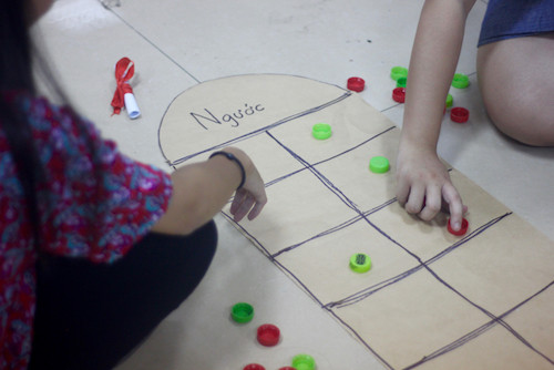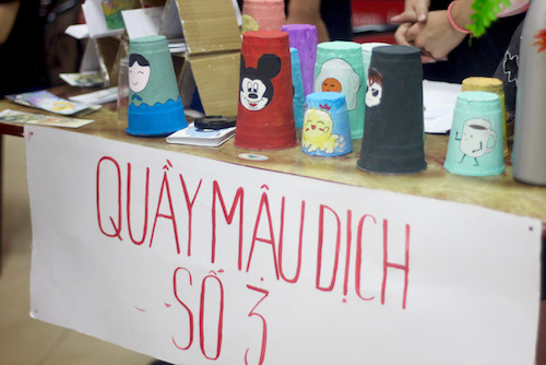 Bên cạnh đó, người thăm quan triển lãm còn có cơ hội được chơi ô ăn quan với những quân cờ chế từ nắp chai nhựa hay chơi xếp hình với những miếng bìa.