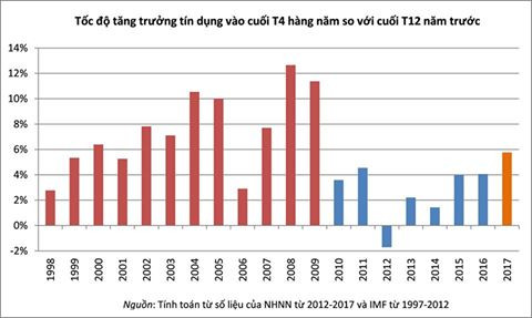 Trong khi đó, theo số liệu ước tính của UBGSTCQG, tính đến hết tháng 4/2017, tín dụng tăng khoảng 5,2%, cao hơn hẳn so với mức 4,2% cùng kỳ năm 2016. Cũng theo báo cáo của UBGSTCQG, trong quý 1/2017, nhóm NHTMNN dẫn đầu với tốc độ tăng trưởng 4,9%. Nhiều NHTM đã đẩy mạnh tín dụng khá cao ngay trong quý 1 như: Lienvietpostbank (11%), NHTM Kiên Long (10,3%), SCB (9%), ACB (8,3%), Vietcombank (8,3%).