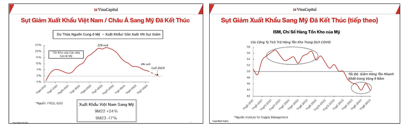 Chuyên gia của VinaCapital cho biết thêm, thay vì mua nhiều sản phẩm hơn khi lệnh phong tỏa COVID-19 được dỡ bỏ, người tiêu dùng lại đổ tiền vào các dịch vụ như du lịch và ăn uống ở ngoài. Do vậy, các công ty ở Mỹ đã phải giải quyết lượng hàng tồn kho này trong suốt năm 2023, mức tồn kho sụt giảm với tốc độ nhanh nhất trong gần 10 năm.