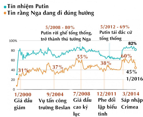 Hơn hai năm trước, khi Nga tổ chức thế vận hội Olympic mùa đông ở Sochi, mức tín nhiệm cho Putin đã sụt giảm. Chỉ 61% người được hỏi ủng hộ ông. Tuy đây là mức cao theo tiêu chuẩn phương Tây, nó lại là mức thấp nhất cho Putin kể từ khi ông nhậm chức. Sau khi Nga sáp nhập bán đảo Crimea năm 2014, làm bùng lên căng thẳng tồi tệ nhất với phương Tây kể từ Chiến tranh lạnh, người Nga dường như vẫn kiên quyết đặt lòng tin vào nhà lãnh đạo.