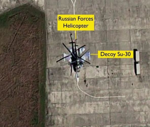 Cơ quan này đăng một hình ảnh vệ tinh cho thấy hình bóng của máy bay chiến đấu Su-30 được vẽ tại căn cứ không quân Kirovske ở Crimea. Tuy nhiên, bất chấp điều này, máy bay trực thăng Nga vẫn hạ cánh trên những hình bóng mồi nhử được sơn màu, làm suy yếu hoàn toàn nỗ lực đánh lừa.