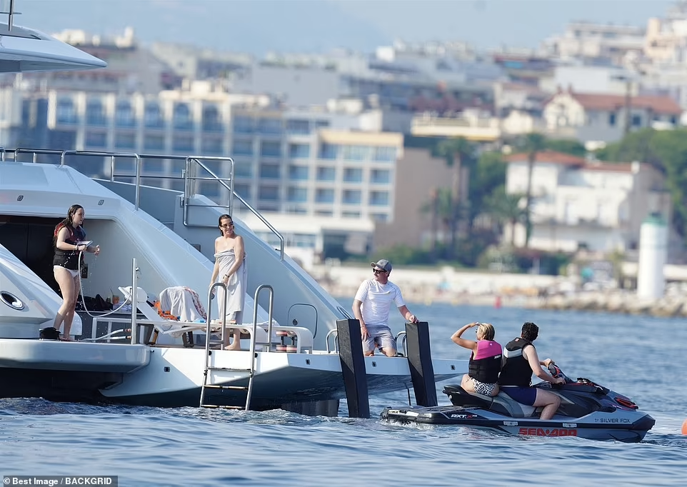 | Cả hai cùng cưỡi mô tô nước trong khi các thành viên khác thư giãn trên du thuyền sang trọng. |