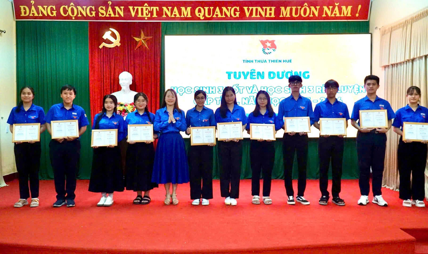 Kết thúc năm học 2023 - 2024, Tỉnh Đoàn TT-Huế quyết định trao tặng danh hiệu Học sinh 3 tốt cấp tỉnh cho 18 đoàn viên, học sinh đã có thành tích tiêu biểu trên các mặt học tập, đạo đức, thể lực; tặng danh hiệu Học sinh 3 rèn luyện cho 3 đoàn viên, học sinh đã có thành tích tiêu biểu trong học tập, rèn luyện tay nghề, thể lực.
