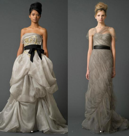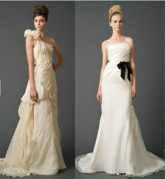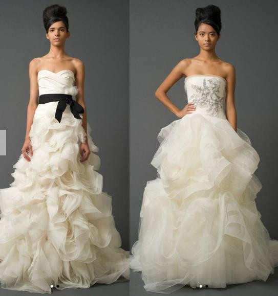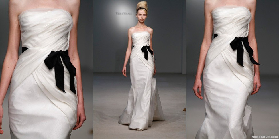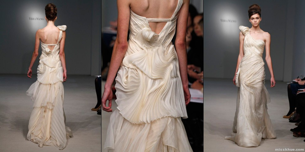 Vera Wang sử dụng chất liệu ren, lụa... để tạo nên những chiếc váy lộng lẫy. Đồng thời, kiểu thiết kế lệch vai, kết hợp khéo léo giữa ren và dải ruy băng khiến cho những bộ váy càng trở nên sang trọng, nổi bật dù không có những màu sắc sặc sỡ.
