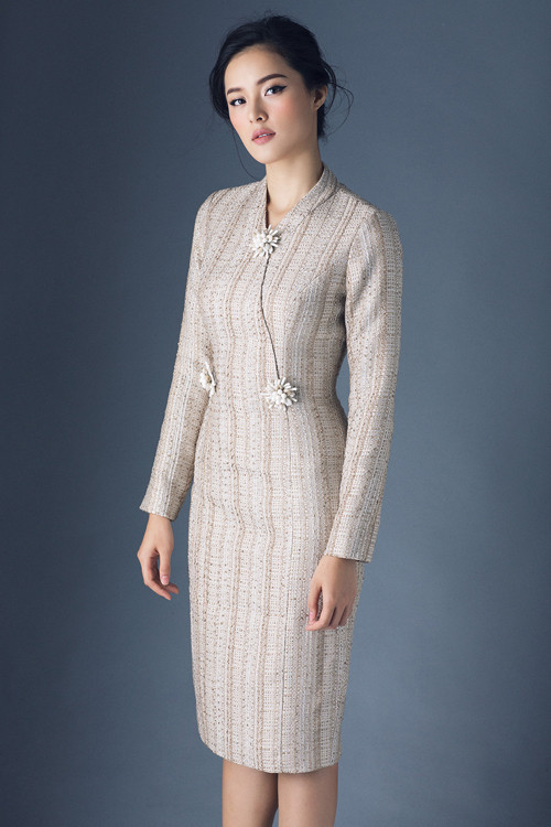 Bộ váy làm từ vải tweed - chất liệu kinh điển của hãng Chanel - đem lại sự ấm áp và sang trọng cho những ngày trở gió.