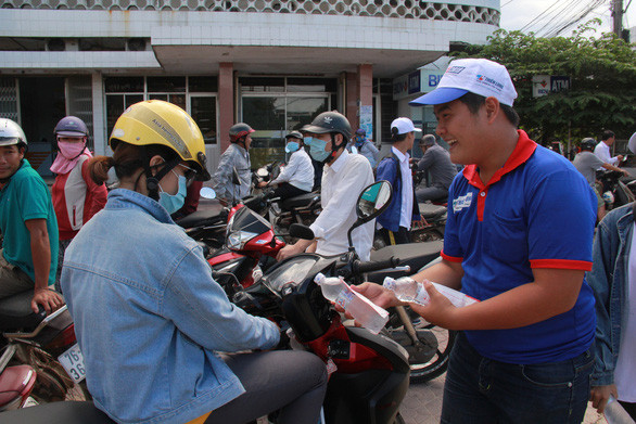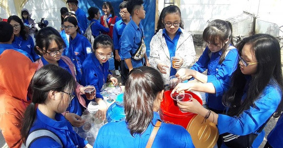 Sinh viên tình nguyện phát nước cho phụ huynh, thí sinh. Ảnh: Nhật Lệ