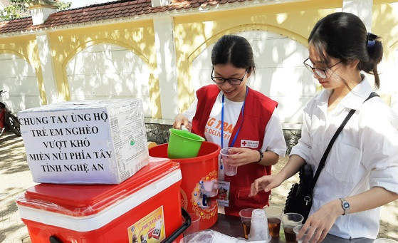 Tại một điểm khác, trời nắng lớn các học sinh rót nước phát miễn phí cho thí sinh dự thi ở điểm thi Trường THPT Lê Viết Thuật, TP Vinh. Ảnh: Doãn Hòa