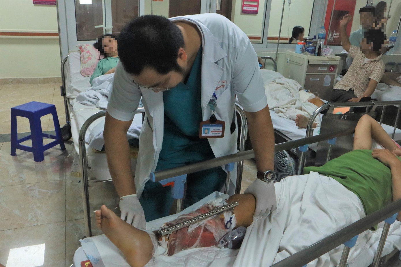 Bác sĩ Nguyễn Đình Hiếu, Trưởng khoa Chấn thương chỉnh hình và y học thể thao cho biết, trong số 4 trường hợp đang điều trị khoa Phẫu thuật Chấn thương chỉnh hình và y học thể thao thì có 1 trường hợp nặng được mổ cấp cứu ngay trong đêm 5/4. Người bệnh bị sốc đa chấn thương: chấn thương sọ não, chấn thương ngực kín, dập phổi, theo dõi chấn thương bụng, gãy hở IIIB cẳng chân phải, dập nát cẳng chân phải… Bệnh nhân đã được hồi sức chống sốc và các bác sĩ phẫu thuật cố định ngoại vi xương chày, cẳng chân phải, xử lí vết thương phần mềm, chuyển vạt che phủ xương. Các tổn thương khác hiện tại ổn định và theo dõi thêm.