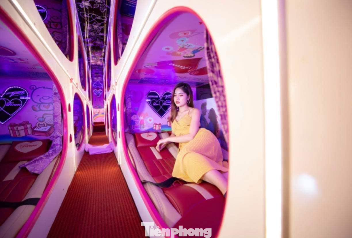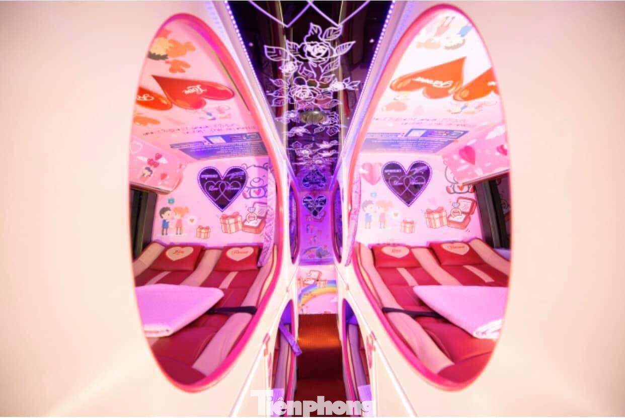 Mục sở thị chiếc xe Inter Love Forever, hệ thống ánh sáng kết hợp màu sắc tạo nên một không gian tình yêu huyền ảo. Trên xe Wi-Fi miễn phí, trong mỗi cabin đều được trang bị màn hình, máy nghe nhạc, xem phim, tai nghe, cổng sạc USB tiện dụng.