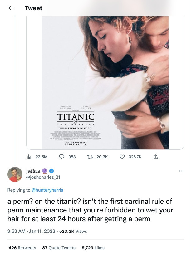 Sự mâu thuẫn trong kiểu tóc của nàng Rose đã tạo nên những màn suy đoán “cười ra nước mắt” trên không gian mạng. Người hâm mộ đùa rằng “Chắc cô nàng đang uốn tóc thì tàu đâm trúng băng thì phải?”. Một người khác thêm vào: “Uốn tóc? Trên tàu Titanic á? Quy tắc cơ bản của uốn tóc là không để nó đụng nước ít nhất 24 giờ sau khi uốn mà trời!”. Một số khán giả còn quả quyết chắc chắn lọn tóc dài và gợn sóng là của... nữ danh ca Celine Dion - người thực hiện ca khúc nhạc phim My Heart Will Go On bất hủ.