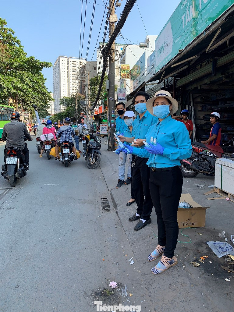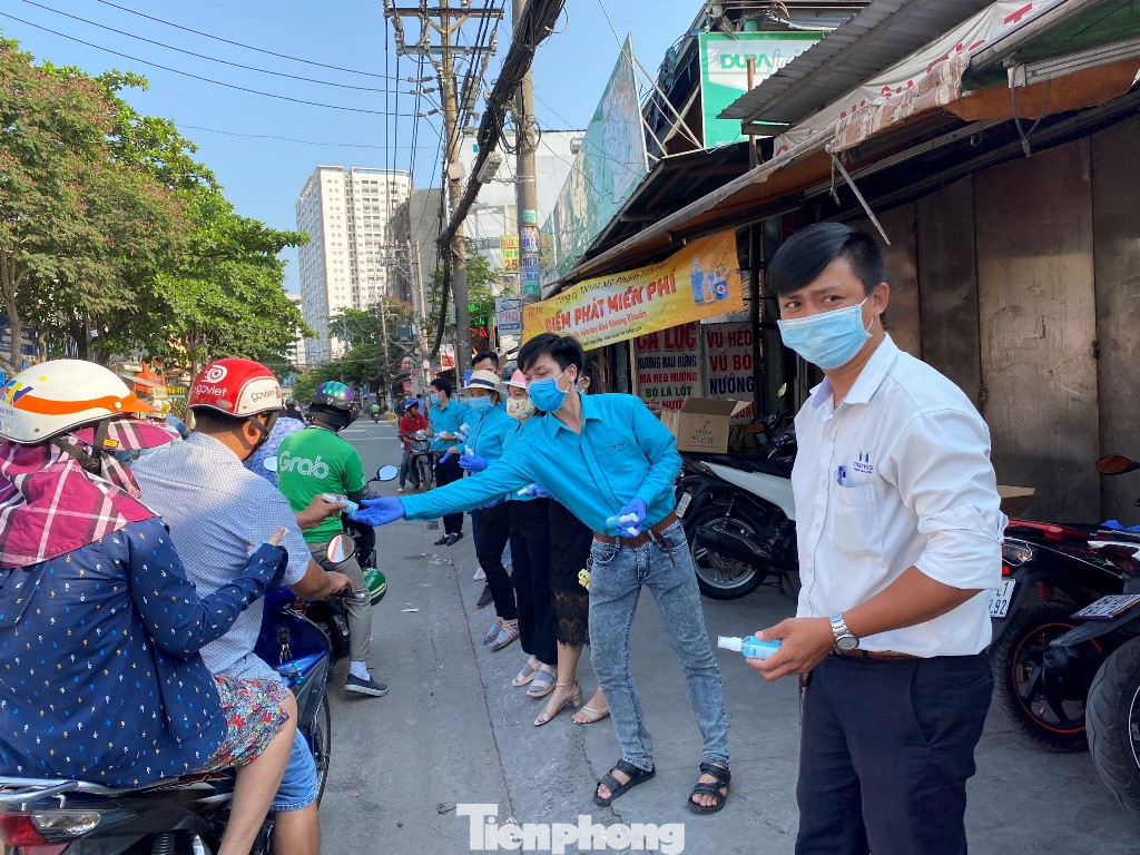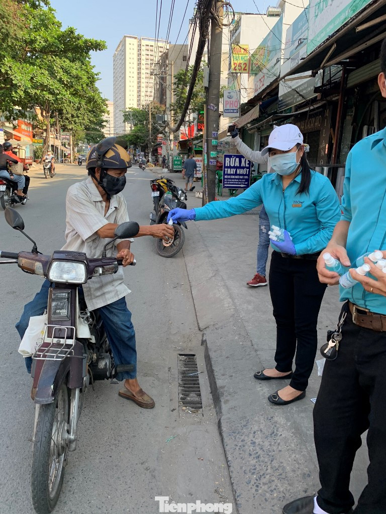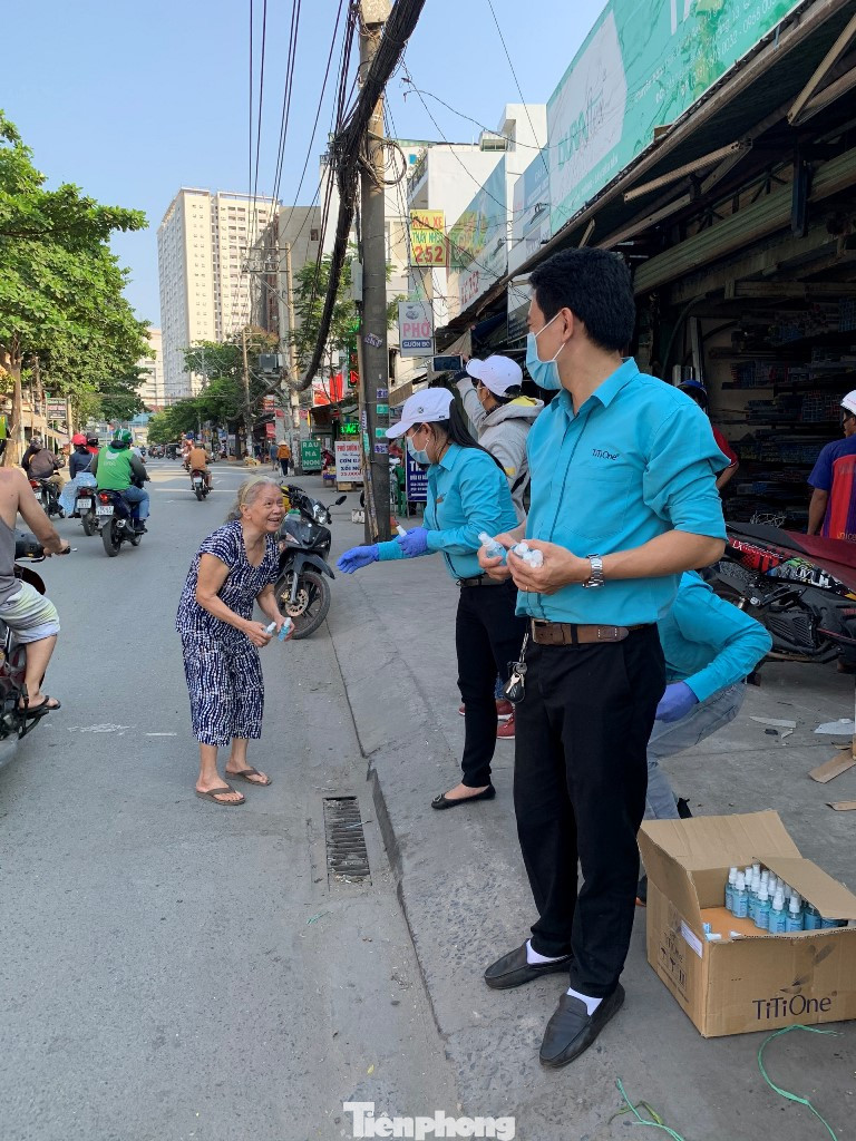 Chiều ngày 26/3, nhiều người đi đường ở khu vực Nguyễn Xí - Nơ Trang Long, gần Bến xe Miền Đông, quận Bình Thạnh ngạc nhiên và vui mừng khi được tặng nước rửa tay miễn phí. Đây là sản phẩm của công ty mỹ phẩm TiTiOne nhằm giúp người dân có thêm sản phẩm bảo vệ trong dịch COVID-19.