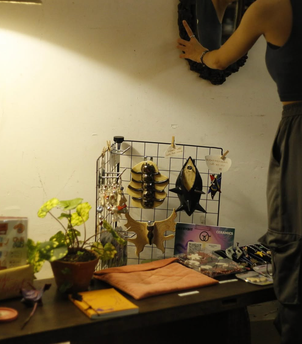 Nhà Phạm còn có một góc tường dành cho sạp hàng nhỏ với mấy món đồ handmade, được các “đồng đội” gửi gắm lại như những bạn “gấu xấu” từ @tudo_hanhphuc, móc khoá len nhỏ xinh của nhà @tiemlenso21, các chậu cây xanh phiên bản mini từ @caythangbay,...