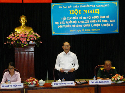 Sáng nay (10/5), Chủ tịch nước Trần Đại Quang và các ứng viên đại biểu Quốc hội khoá XIV thuộc đơn vị bầu cử số 1 (TPHCM) đã tiếp xúc cử tri quận 3.