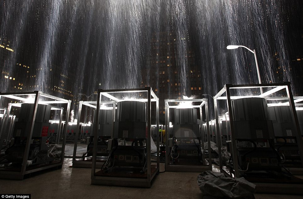 | Các kiến trúc sư chạy thử nghiệm hệ thống đèn chiếu sáng dưới trời mưa to để đề phòng trường hợp thời tiết xấu vào chủ nhật, ngày 11-9 sắp tới. |