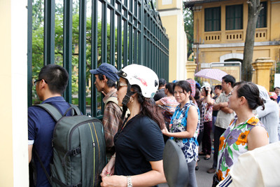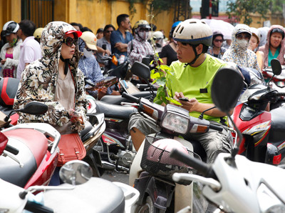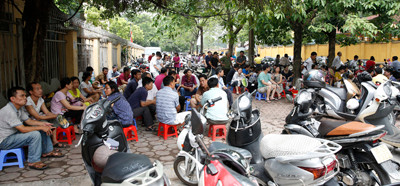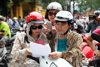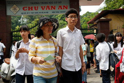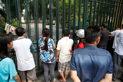 Khảo sát tại một số điểm thi trong nội thành Hà Nội, có rất nhiều phụ huynh đưa con đi thi và chờ ngay tại cổng trường. Tại điểm thi trường THPT Chu Văn An, phụ huynh đứng chờ con kín đường Thụy Khê gây ách tắc giao thông.