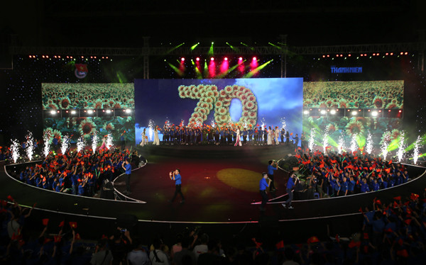 TPO - Tối 17/8, tại Hà Nội, T.Ư Đoàn tổ chức Chương trình nghệ thuật có chủ đề “Tự hào Tổ quốc tôi” chào mừng kỷ niệm 70 năm Cách mạng Tháng 8 và Quốc khánh 2/9. Tham gia chương trình có gần 4.000 nghệ sỹ, diễn viên và đoàn viên thanh niên.