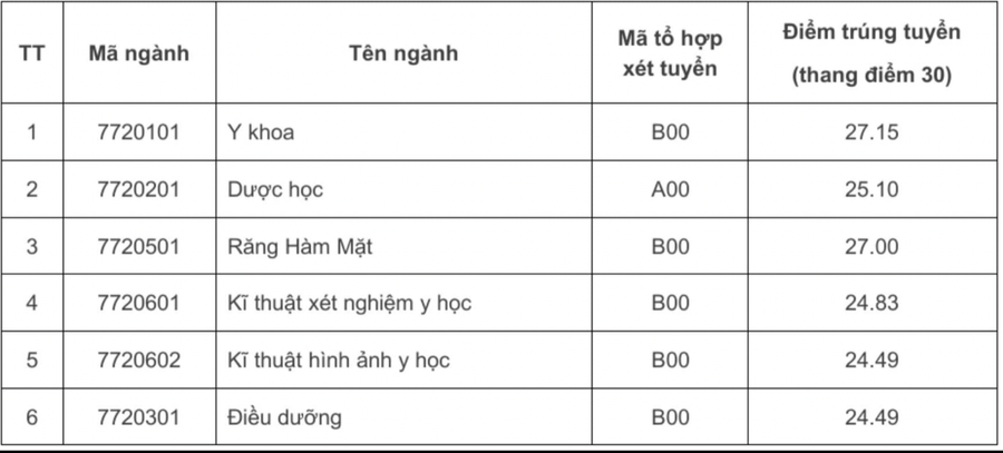 Ở tổ hợp truyền thống B00, Y khoa vẫn dẫn đầu với 28,27 điểm, tăng 0,54 so với năm ngoái. Nếu có chứng chỉ tiếng Anh IELTS 6.5 hoặc tiếng Pháp DELF B2 (hoặc tương đương), thí sinh chỉ cần đạt 26,55 điểm để đỗ.