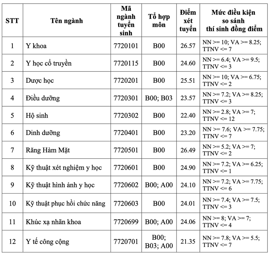 Các trường Y dược khác trong cả nước, ngành Y khoa, Răng – hàm mặt đều ở mức cao: Trường Đại học Y Dược Hà Nội, ĐHQG Hà Nội ngành Y khoa 27,15 điểm và ngành Răng- Hàm- Mặt lấy 27 điểm; Trường Đại học Y Dược TPHCM ngành Y khoa lấy 27,8 điểm; trường Y dược Thái Bình ngành y khoa 26,17 điểm;...