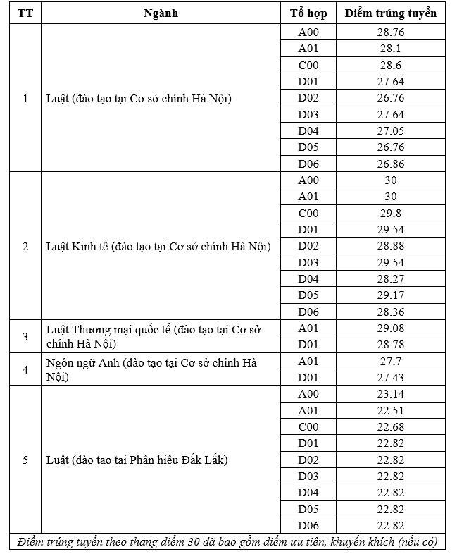 Trong đó, ngành Luật với 9 tổ hợp xét tuyển có điểm chuẩn từ 26,76 - 28,76/30 điểm.