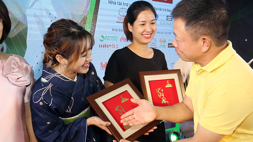 Đại diện Ban tổ chức, nhà báo Lê Xuân Sơn - Tổng Biên tập Báo Tiền Phong, Trưởng BTC - và nhà báo Phùng Công Sưởng - Phó Tổng Biên tập Báo Tiền Phong, trao kỷ niệm chương cho nhà tài trợ.