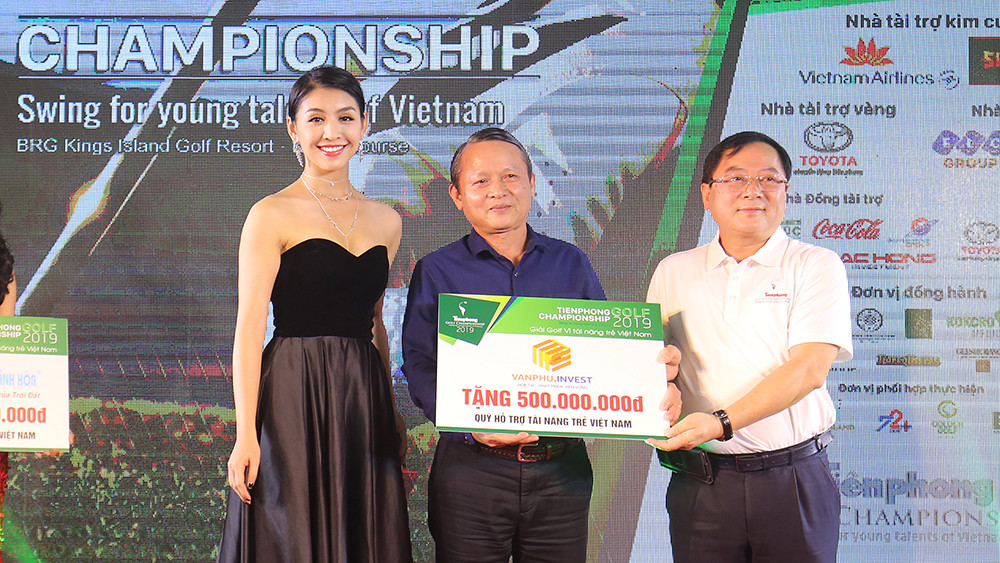Đại diện công ty Văn Phú Invest trao cho Quỹ hỗ trợ Tài năng trẻ Việt Nam 500 triệu đồng.