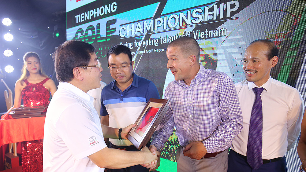 Phó Tổng Biên tập Báo Tiền Phong Phùng Công Sưởng trao giải Ba cho các golfer.