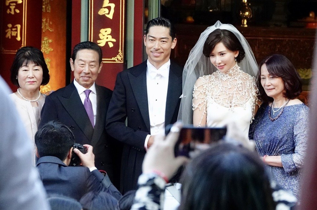 Chú rể Akira diện bộ tuxedo lịch lãm. Anh liên tục cúi chào mọi người, gương mặt điển trai rạng ngời hạnh phúc.