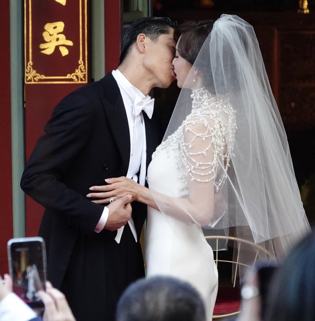 Cặp vợ chồng nổi tiếng trao nhau nụ hôn đắm đuối trước sự chứng kiến của đám đông. Được biết, toàn bộ nghi lễ đám cưới diễn ra chỉ trong 30 phút.