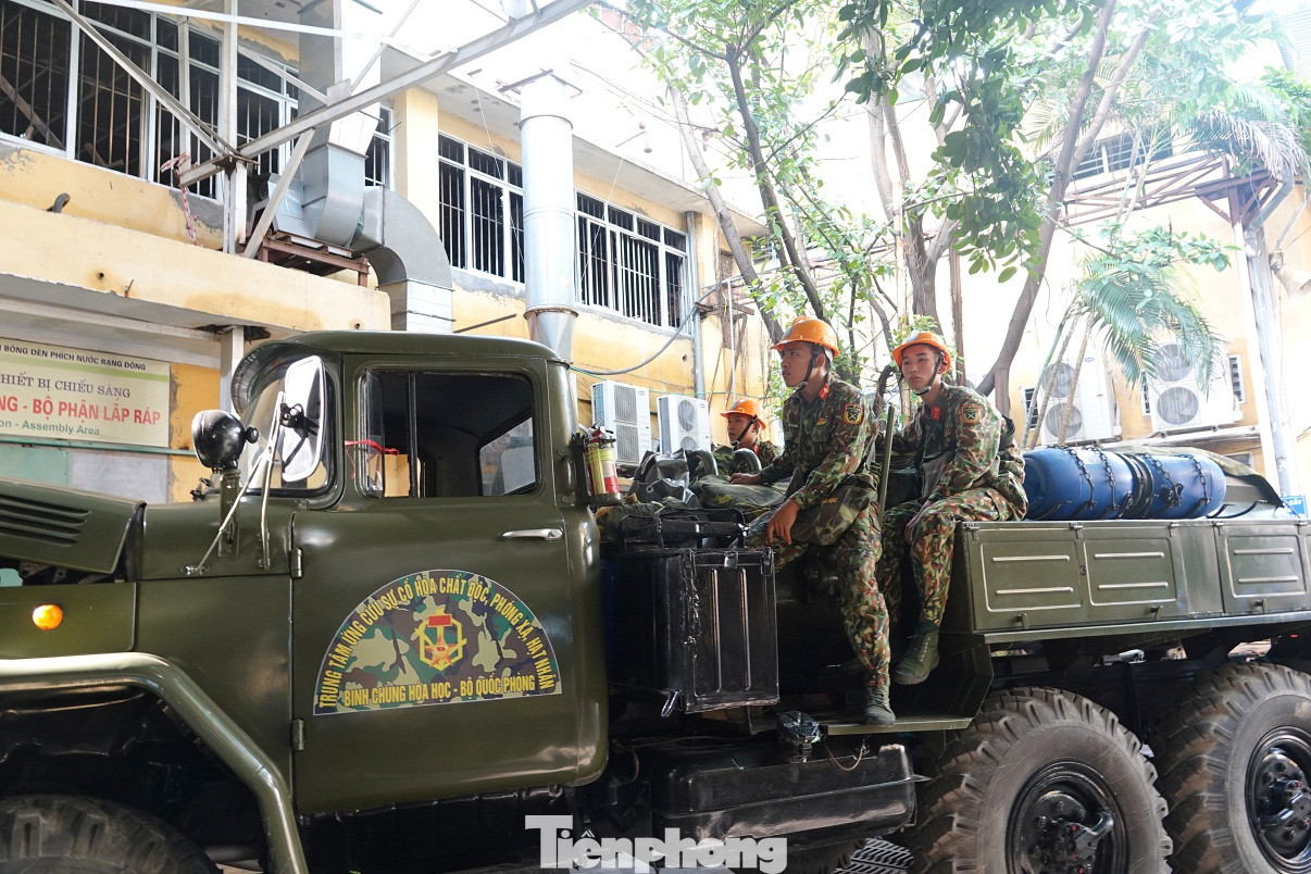 Cách đó không xa, Bộ đội Hoá học chuẩn bị các thiết bị, phương tiện sẵn sàng cho công tác xử lý môi trường tại khu vực này