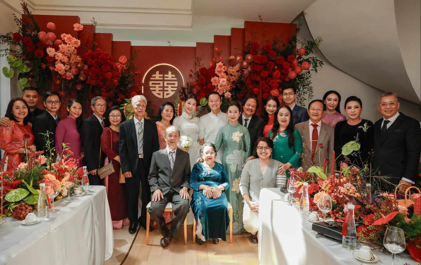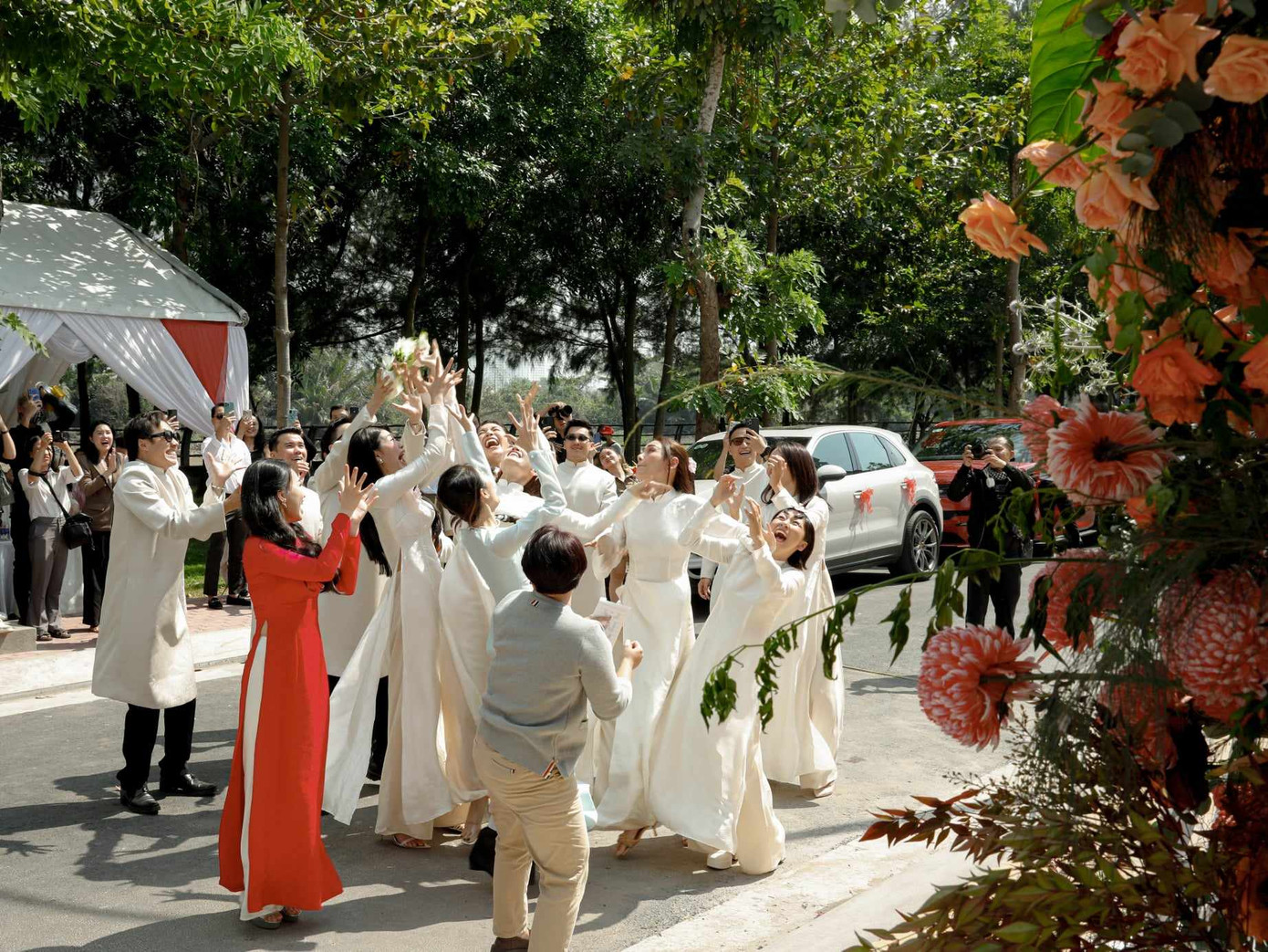 Sau khi các nghi thức hoàn tất, cô dâu và chú rể tiến bước ra ban công để tung hoa. Lần này, người nhận được hoa cưới là Võ Hoàng Yến. Trong khi đó, Minh Tú - người được tặng hoa cưới trong lễ độc thân cũng rất hào hứng chụp hoa trong lần tung hoa này và bị vấp té. Sự nhiệt tình của nữ siêu mẫu khiến khách mời đều phì cười. Sau đó, các phù dâu sẽ nhận được 1 phong bao lì xì và món quả nhỏ là phần rượu tây.