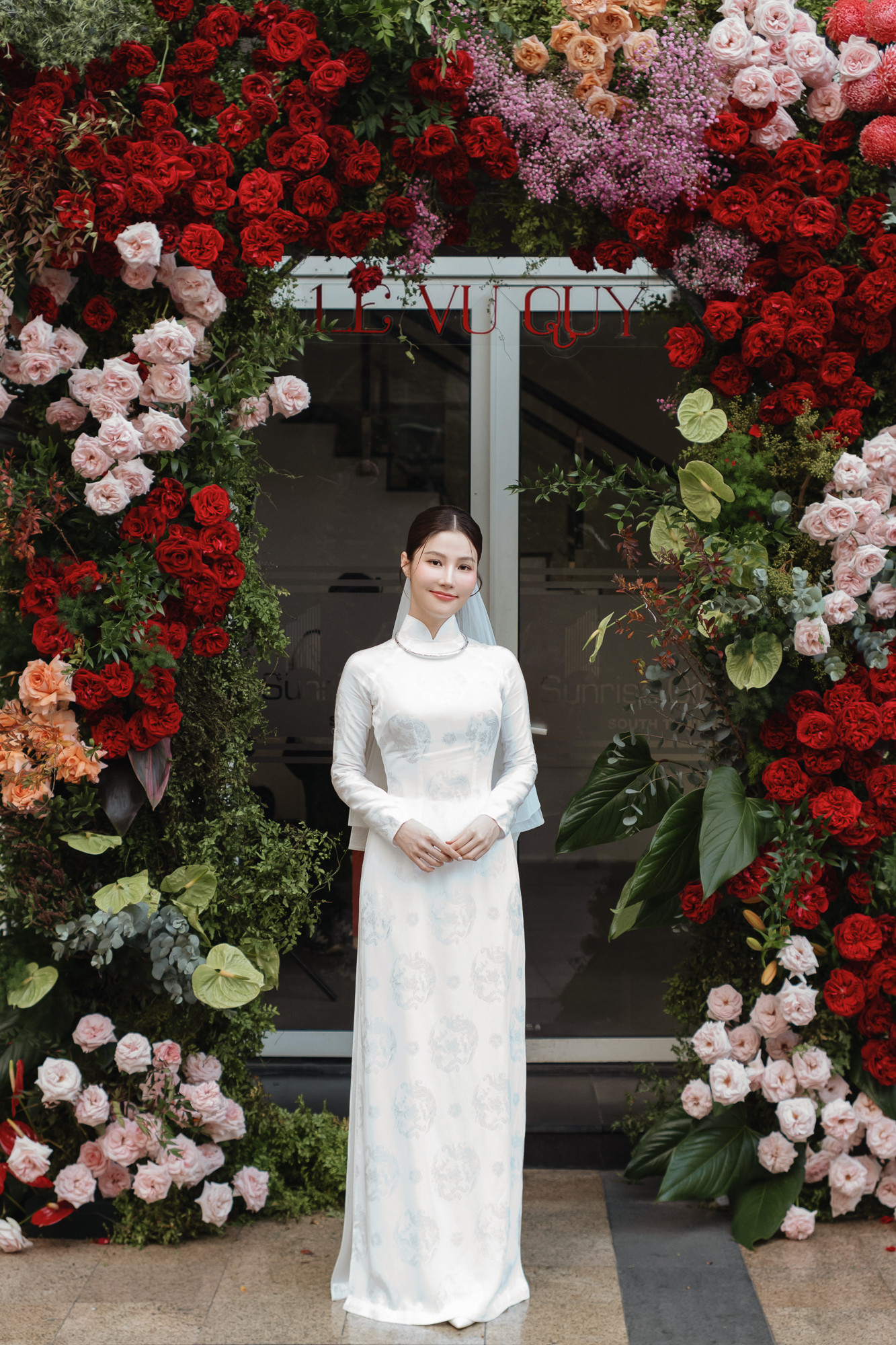 Không cầu kỳ, Diễm My 9X và dàn phù dâu đều chọn áo dài tông màu trắng trong ngày lễ trọng đại này. Cô dâu vốn sở hữu nhan sắc ưa nhìn nên việc trang điểm nhẹ nhàng, trang phục đơn giản đã giúp tôn lên vẻ đẹp vốn có của nữ diễn viên.