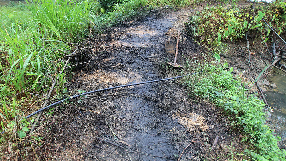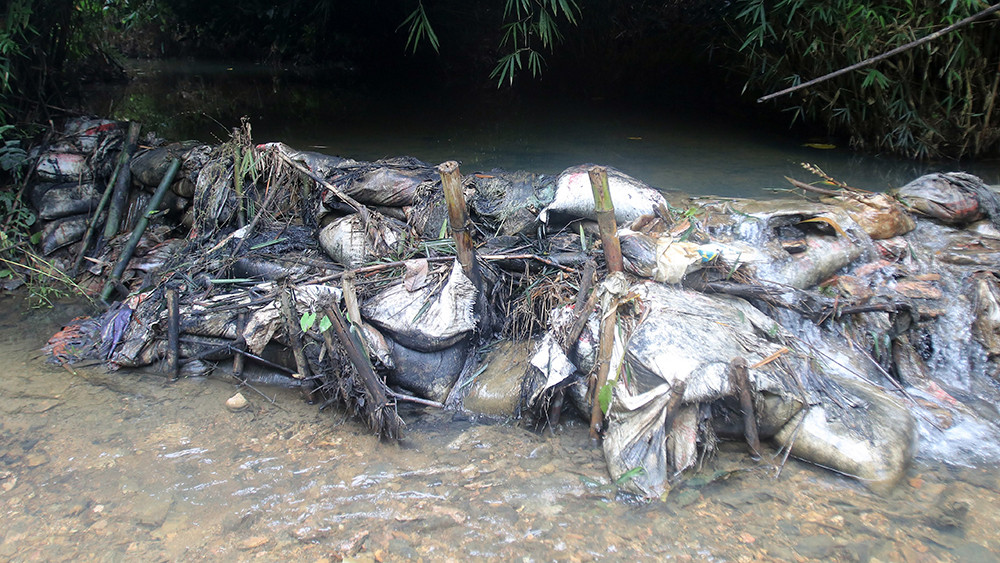 Những dấu vết dầu đen vẫn còn loang lổ nơi lòng suối.