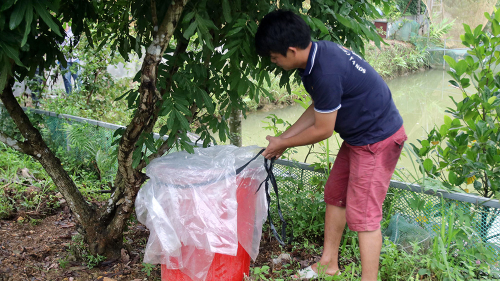 Anh L chất cá vào thùng nhựa dùng để bón cây.