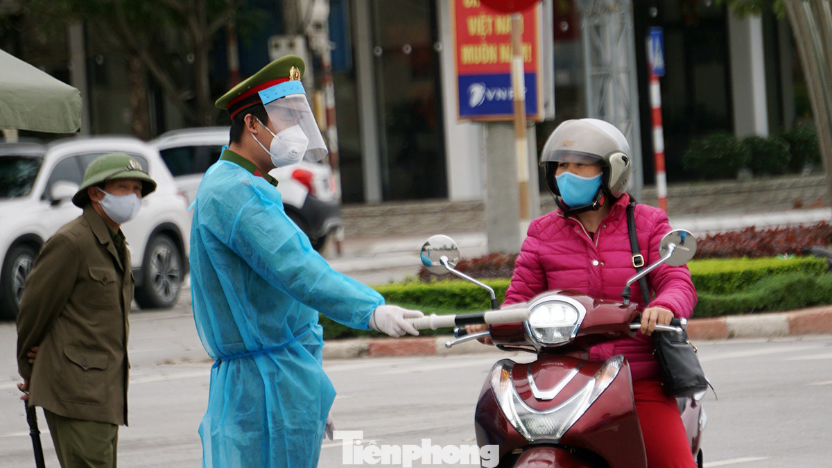 Trước Quảng trường Sao Đỏ - Chí Linh, lực lượng liên ngành y tế, công an, quân đội duy trì cán bộ kiểm soát, đo thân nhiệt và yêu cầu người dân khai báo y tế khi ra ngoài.
