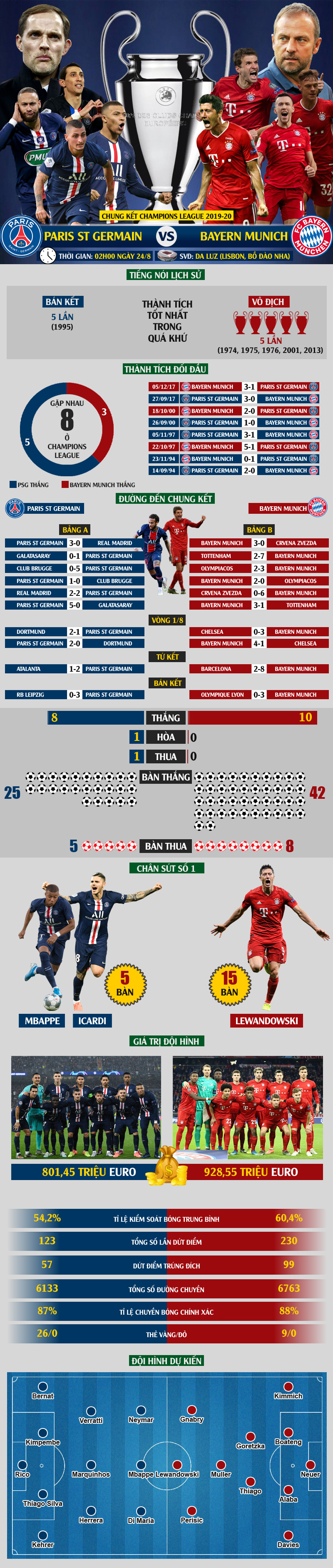 TPO - Với sự đầu tư rất lớn, PSG đã góp mặt ở trận chung kết Champions League lần đầu tiên trong lịch sử. Tuy nhiên, Bayern Munich lại là một trong những CLB thống trị sân chơi này với 10 lần vào chung kết trước đây.