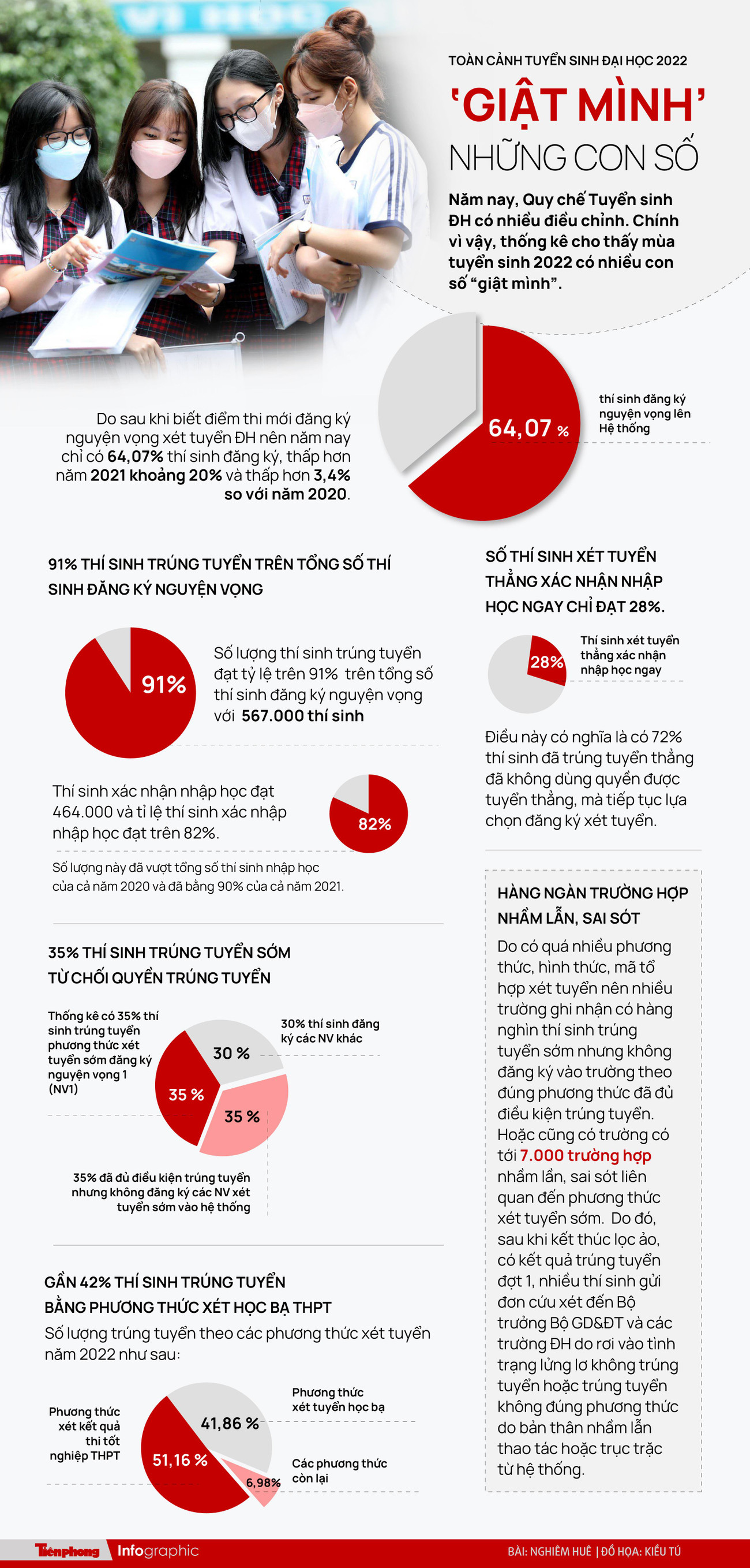 TPO - Năm nay, Quy chế tuyển sinh đại học có nhiều điều chỉnh. Chính vì vậy, thống kê cho thấy mùa tuyển sinh 2022 có nhiều con số “giật mình”.