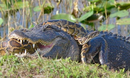Cảnh tượng ngoạn mục về trận tử chiến một mất một còn giữa hai cơn ác mộng khủng khiếp nhất là trăn khổng lồ và cá sấu sát thủ đã được chụp lại tại vườn quốc gia Everglades ở Homestead, Florida Mỹ bởi một du khách vô danh.