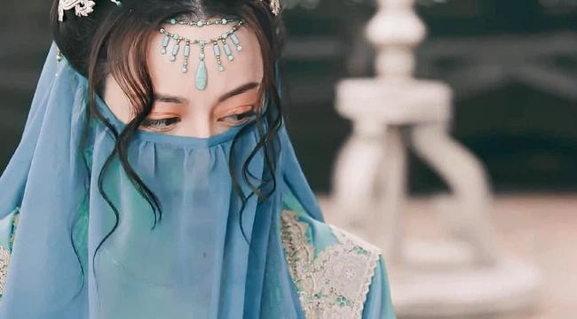 Trang phục với tông màu xanh mướt nhẹ nhàng, đôi mắt to, làn da trắng sáng, đôi môi nhỏ nhắn ẩn hiện sau tấm mạng che mặt làm “bùng nổ visual” xuất sắc của Địch Lệ Nhiệt Ba. Với gương mặt lai tây xinh đẹp sắc sảo, Địch lệ Nhiệt Ba thực sự rất hợp với tạo hình Tây Vực.