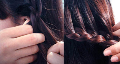 Bước 2: Bạn tết lần lượt như vậy theo chiều hướng xuống của tóc và đến gần đuôi tóc thì dừng lại. Cố định tóc bằng một dây chun nhỏ.