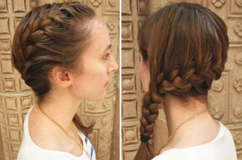 Bước 5: Tới phần mang tai trái, bạn hãy tết toàn bộ phần tóc thành 3 lọn như bình thường cho tới hết. Cột chặt tóc bằng thun buộc. Bạn có thể nới lỏng phần tóc tết để sở hữu mái tóc đẹp tự nhiên.