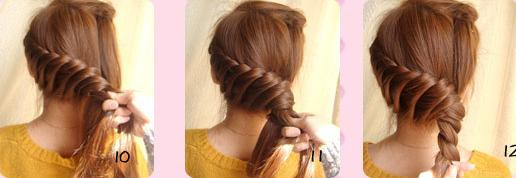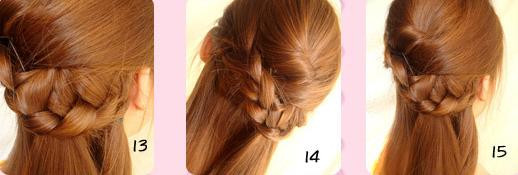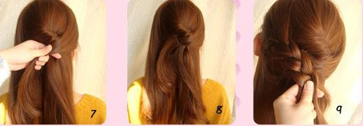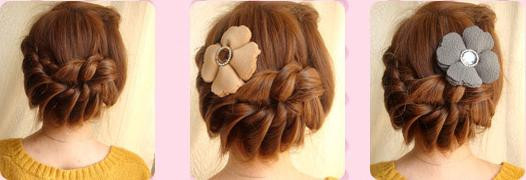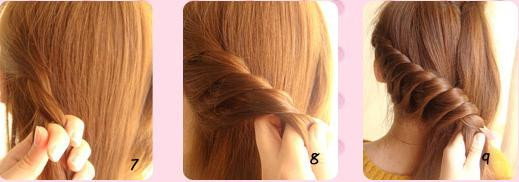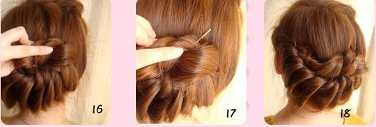 Lấy hai lọn tóc nhỏ sát tai tết xoắn lại với nhau như vặn thừng. Lần lượt lấy tóc phía sau tết thành một đường tròn quanh đầu.