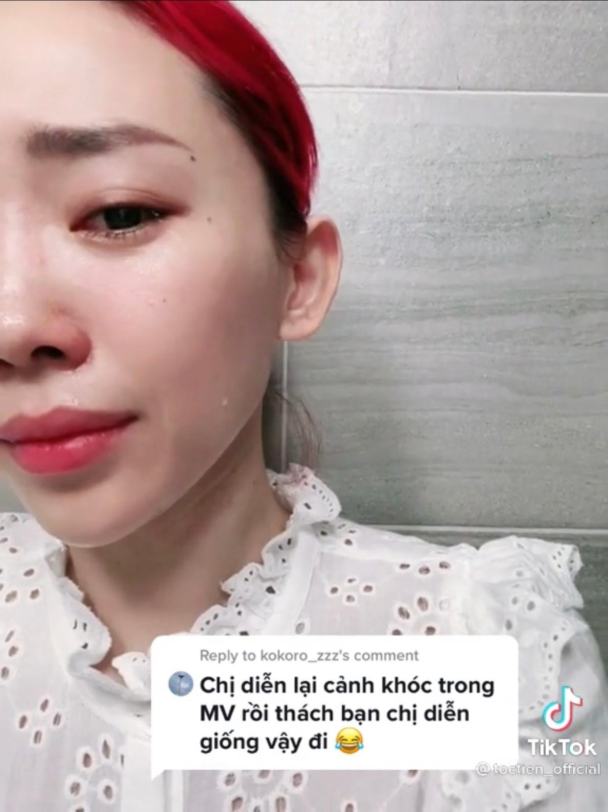 Thế nhưng ở một diễn biến khác, Tóc Tiên khiến khán giả "cười ra nước mắt" khi diễn lại chính phân cảnh khóc của mình. Cụ thể, khi được fan yêu cầu "chị diễn lại cảnh khóc trong MV đi", nữ ca sĩ đã ngay lập tức "nhập vai" với đôi mắt đỏ hoe, nước mắt chảy thành dòng.