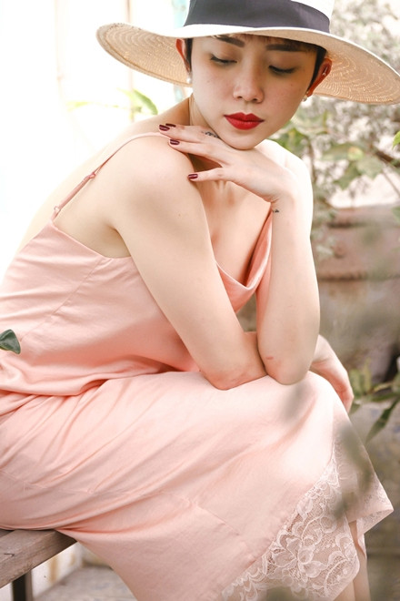 Với mái tóc ngắn nổi bật cùng bộ váy hai dây mỏng manh màu hồng pastel, nữ ca sĩ khoe vẻ đẹp thanh tân, gợi cảm.