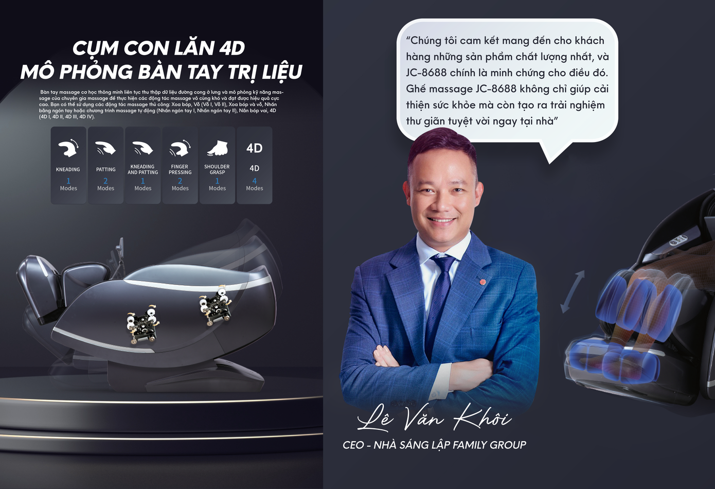 Theo đại diện của Tokyo Care - CEO Lê Văn Khôi, JC-8688 không chỉ là một công cụ massage mà còn là một phương pháp trị liệu chuyên sâu. “Chúng tôi cam kết mang đến cho khách hàng những sản phẩm chất lượng nhất, và JC-8688 chính là minh chứng cho điều đó. Ghế massage JC-8688 không chỉ giúp cải thiện sức khỏe mà còn tạo ra trải nghiệm thư giãn tuyệt vời ngay tại nhà”